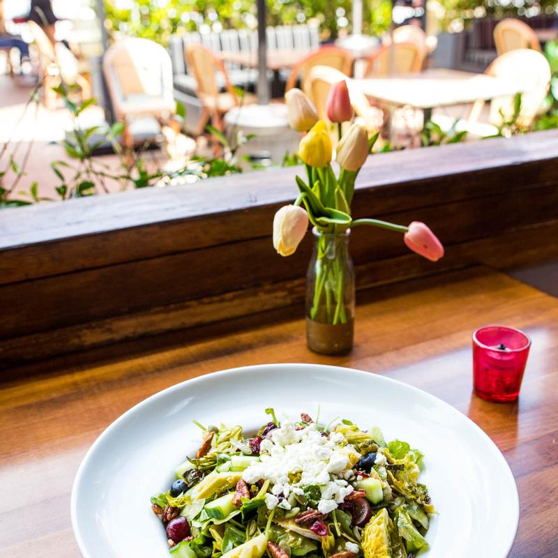 Kale, Romaine, Brussel Sprouts, Grapes, Blueberries, Dried Cranberries, Cucumbers, Red Onions, Candied Pecans, Toasted Pepitas, Goat Cheese, Housemade Strawberry Vinaigrette